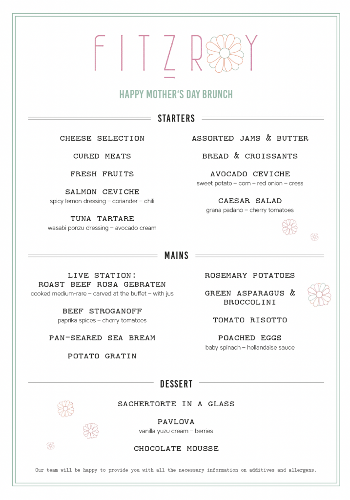 Look forward to a special brunch that puts sharing and enjoying time with your mum at the center: featuring refined takes on classics, fresh spring creations, and sweet surprises à la FITZROY. Alongside, expect aromatic coffee, sparkling drinks, and the right setting for a relaxed, indulgent Sunday.
