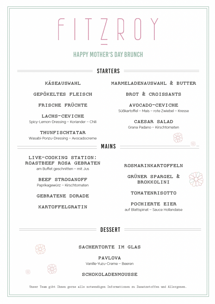 Freut euch auf einen besonderen Brunch, der den gemeinsamen Genuss mit deiner Mutter ins Zentrum stellt: mit raffiniert interpretierten Klassikern, frühlingsfrischen Kreationen und süßen Überraschungen à la FITZROY. Dazu gibt’s aromatischen Kaffee, prickelnde Drinks und die passende Atmosphäre für einen entspannten, genussvollen Sonntag.