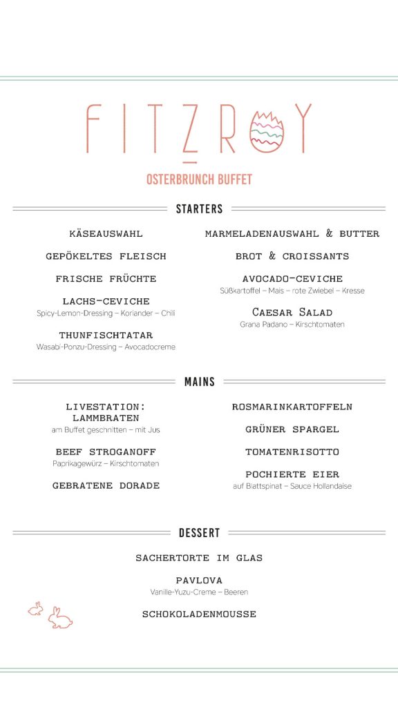 Freut euch auf ein exklusives Buffet mit raffiniert interpretierten Klassikern, frühlingsfrischen Kreationen und süßen Überraschungen à la FITZROY. Dazu gibt’s aromatischen Kaffee, prickelnde Drinks und wie immer eine gute Portion Leichtigkeit, Genuss und Stil.