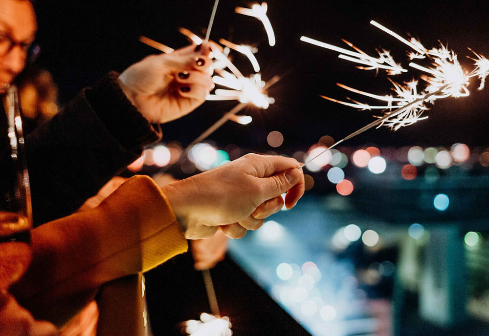 Zum Jahreswechsel: Mitternachtssnack, ein Glas Champagner und danach Party mit Livemusik und DJ bis 3 Uhr – mit Blick über die Stadt.
